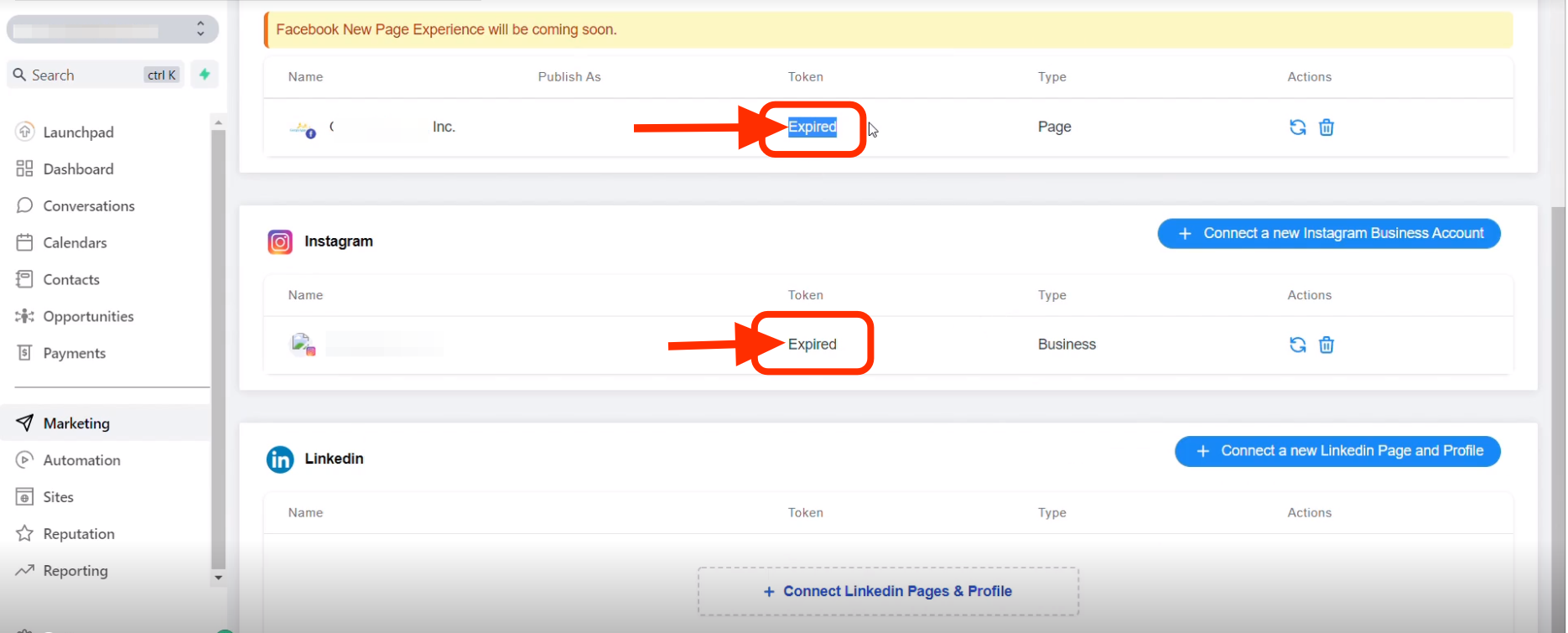 To reconnect a page/group within the social planner tab, please reconnect using the same User's social media account that originally connected the page/group to the location or have the current user head into the locations Settings > Integrations > Click on disconnect, then the connect button for the accounts with expired tokens.